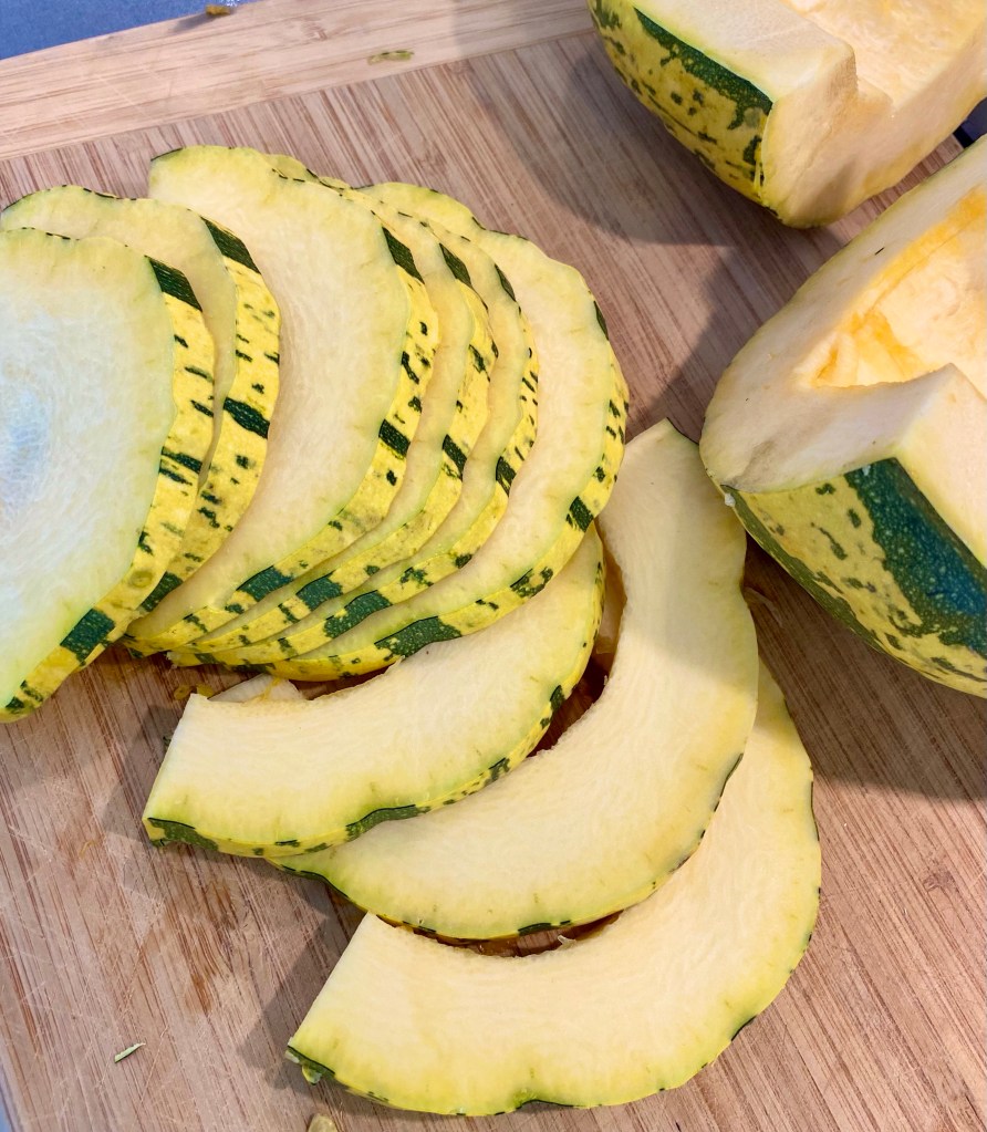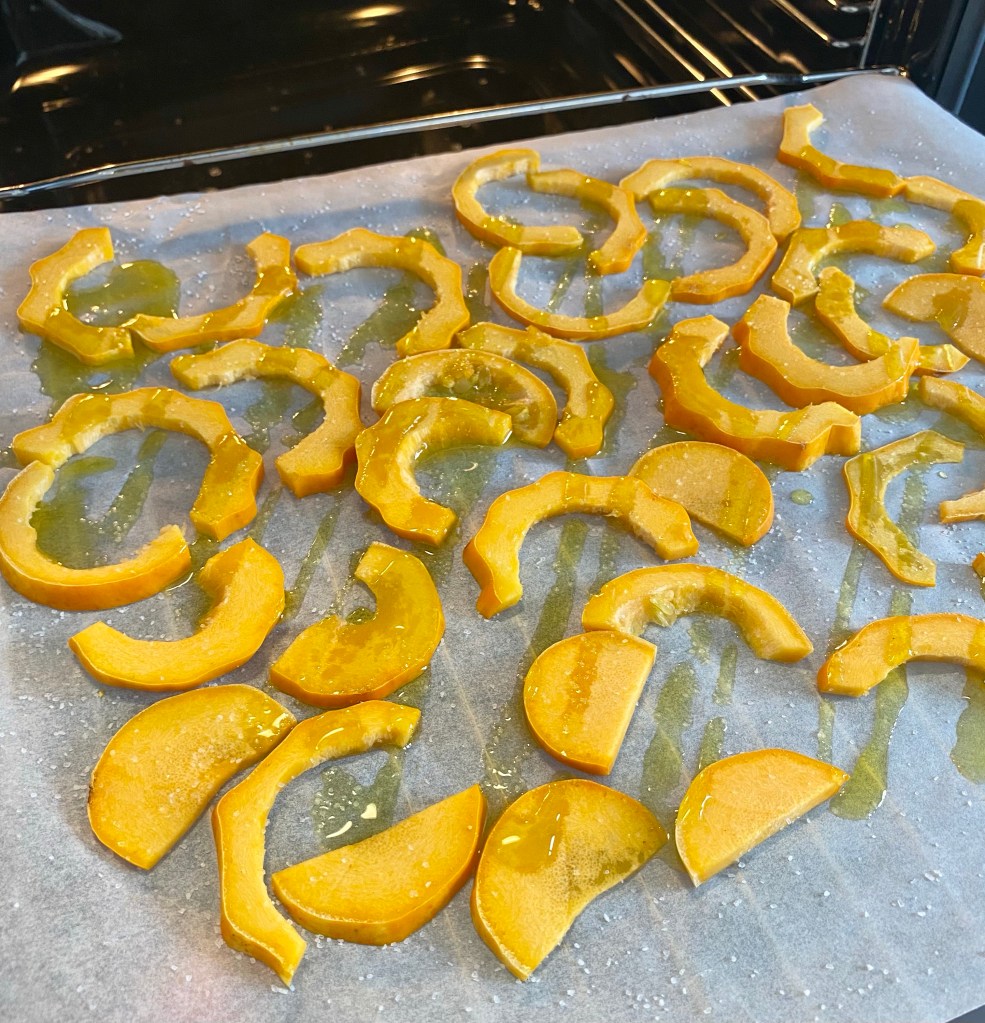 Dela pumpan i lite tunnare skivor (den behöver inte skalas – skalet blir mjukt i ugnen), ringla över lite olivolja och strö pĂ„ salt. Rosta i ugnen i 15 min