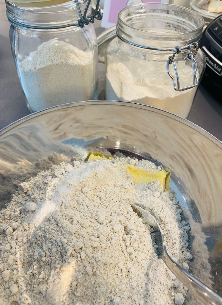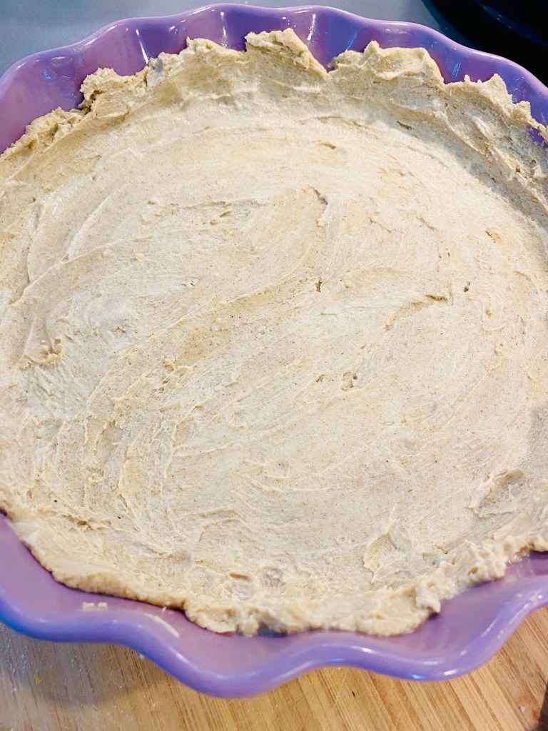 KnÄda ihop allt och sist det kalla vattnet, smörj in en pajform och tryck sedan ut degen med blöta hÀnder. StÀll in i kylen ca 30 min