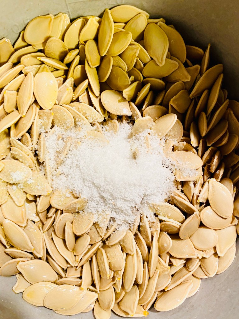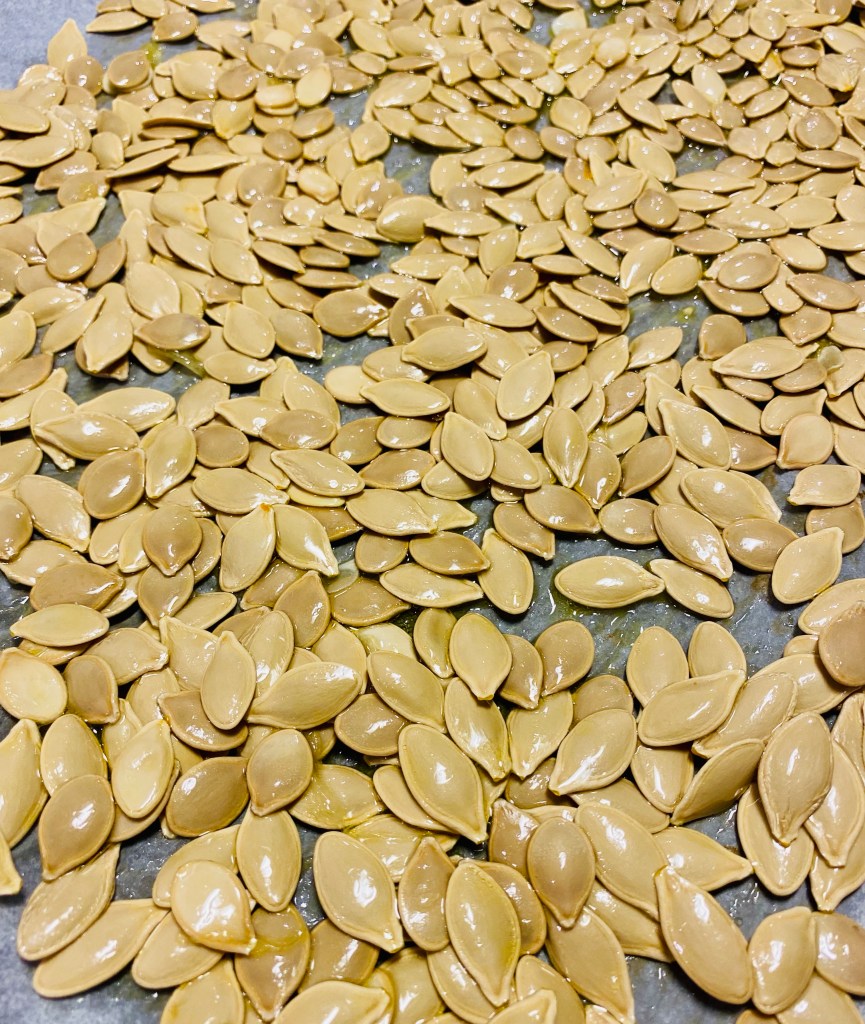 Blanda pumpakĂ€rnorna med lite olivolja och salt i en skĂ„l och hĂ€ll ut pĂ„ en bakplĂ„tspappersklĂ€dd plĂ„t – rosta kĂ€rnorna i ugnen ca 30 min (rör om efter halva tiden) – smaken blir vĂ€ldigt lik popcorn đ