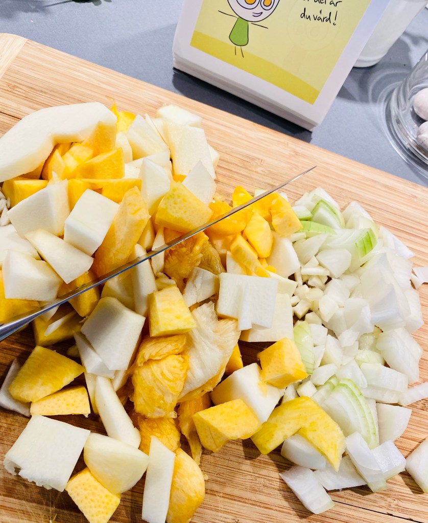 Hetta upp olivolja i en stor kastrull och skĂ€r lök, vitlök och pumpa i grova delar – hĂ€ll ner det i grytan och lĂ„t allt stekas i oljan (doften Ă€r underbar!)