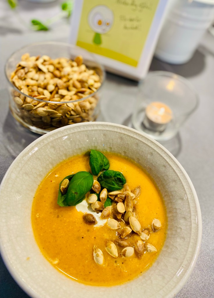 Pumpasoppa med fĂ€rskost och rostade pumpakĂ€rnor đ