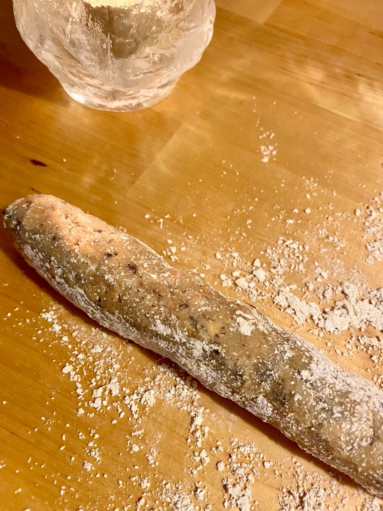 Ta ut degen frÄn kylen, strö lite havremjöl pÄ bÀnken och rulla ut degen till en fin liten rulle