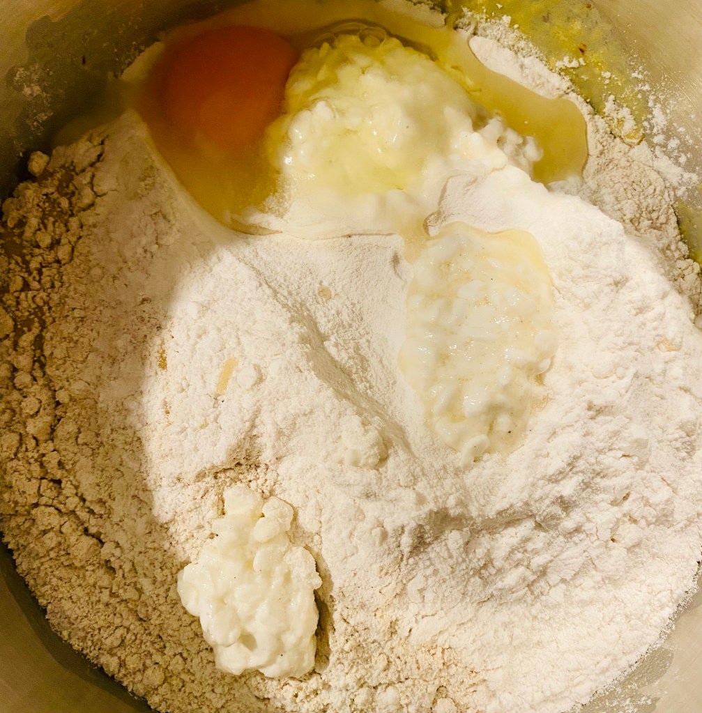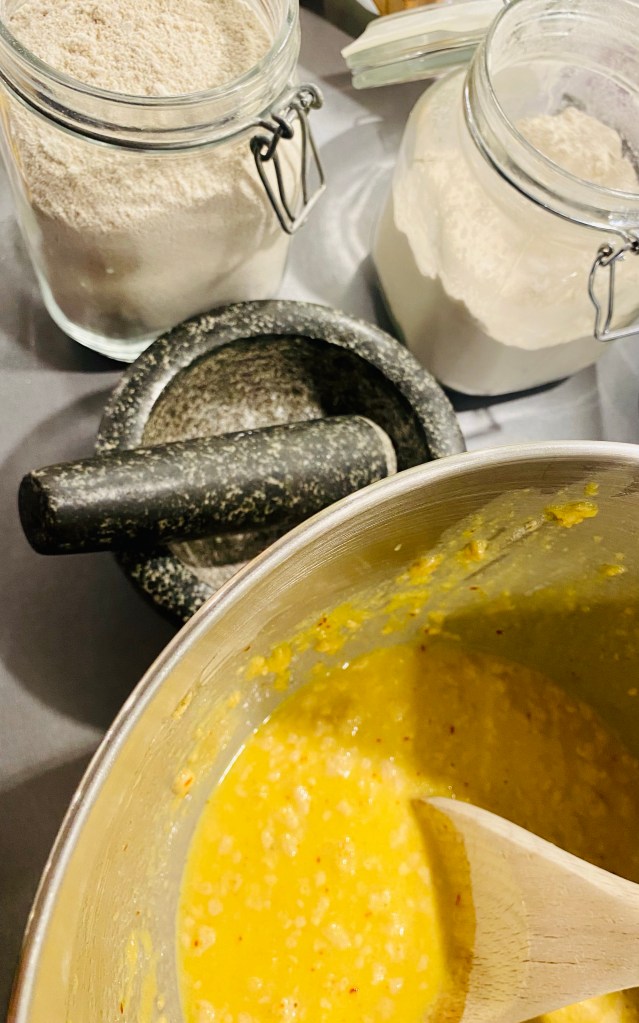 Värm till fingervarmt – häll i en bakbunke och blanda i saffran, socker, jäst och fiberhusk och låt svälla ca 15 min