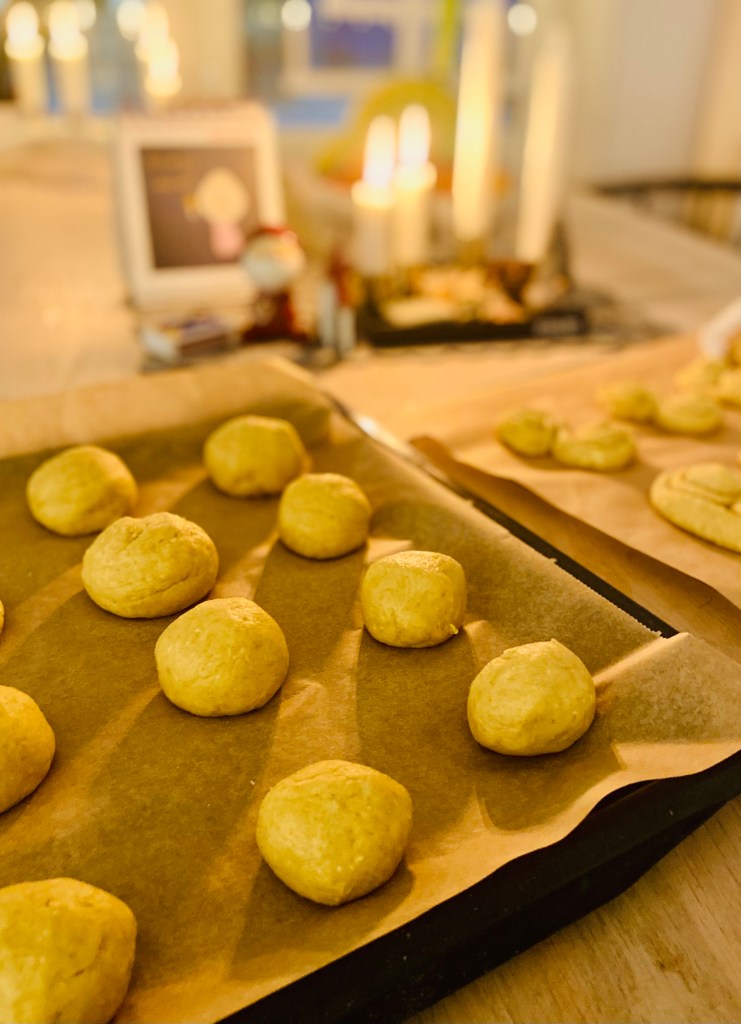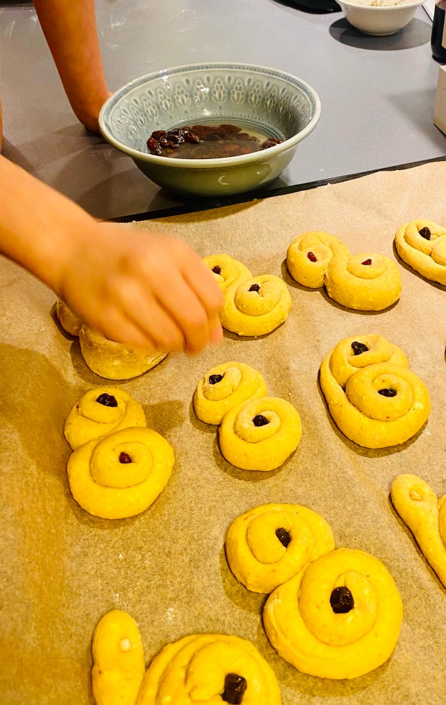 Forma till lussebullar i vilka former som helst – vi gjorde 10 st semlor också 🤩 lägg dem på bakplåtspappersklädda plåtar och låt jäsa ca 40-50 min under duk
