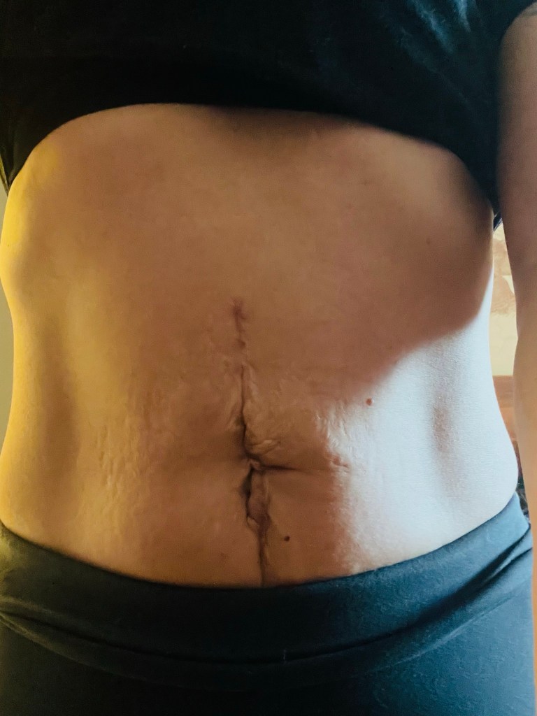 Såret börjar kännas helt ok- lite obehagligt att röra vid det men jag eller min man masserar och drar i det för att hålla det mjukt och stimulera läkning. Jag är öm när man rör på såret men i övrigt känner jag ingen smärta från mina magmuskler. När jag vänder mig i sängen får jag ont men det är allt!