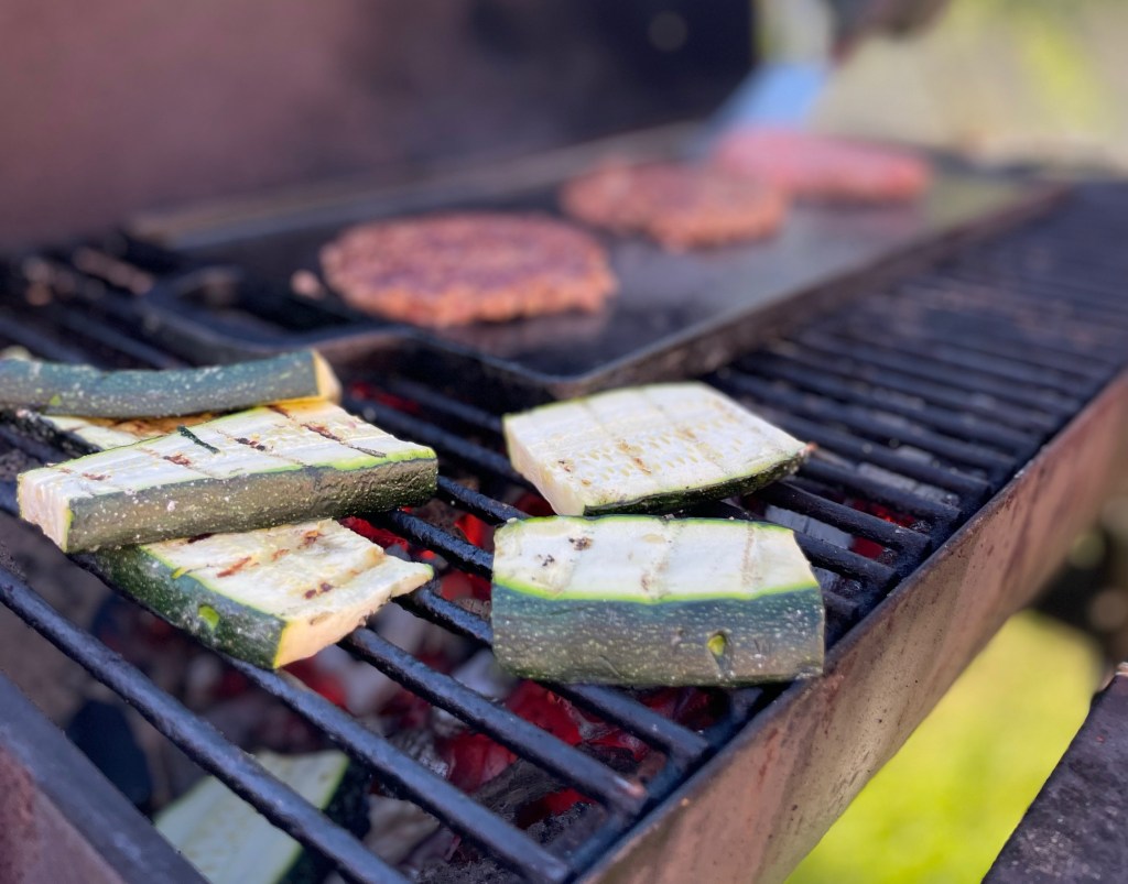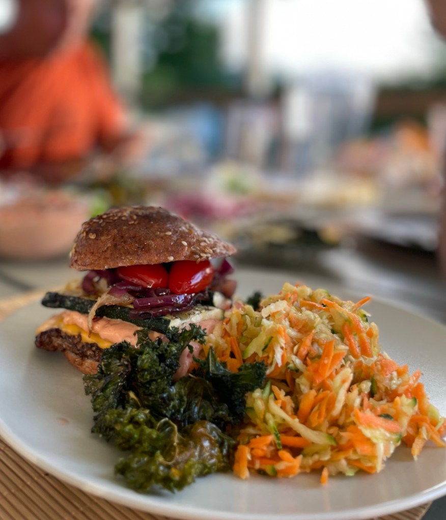 Forma hamburgare i valfri storlek- tryck ut dom ordentligt. Hetta upp en stekpanna och stek hamburgarna några minuter på varje sida. Salta och peppra. Lägg på ost om du vill och låt smälta. Servera burgaren i stora sallatsblad med tillbehören ovan (gurka, tomat, stekt och rå lök, zucchini, bacon och dressing).