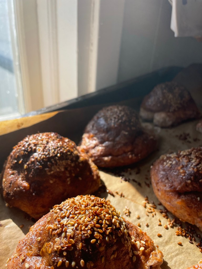 Pensla med vispat ägg och strö sesamfrön eller annat frö över.