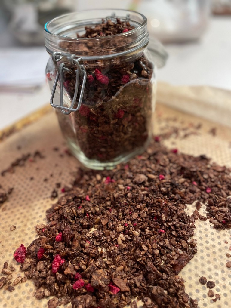 Smält kokosoljan. Blanda ihop den med allt utom hallonen och grädda i 150 grader i ca 30 min. Rör om med jämna mellanrum. Låt svalna och blanda ihop med hallonen och sätt i en ej tätslutande burk eller papperspåse. Låt den få lite luft om den inte är helt torr.
