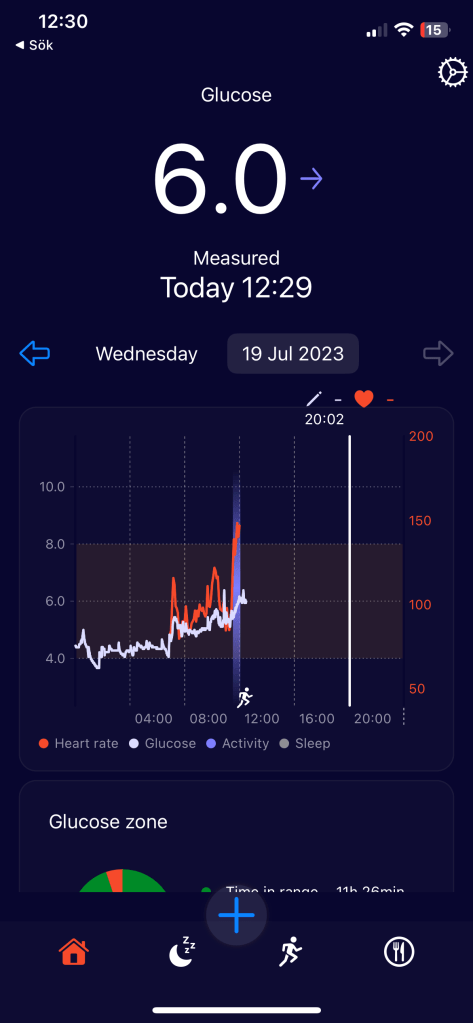 Träning igen- blir ju helt slut av det här projektet 😅 men det är så kul att testa olika grejer och se blodsocket och puls i appen från @beep.insights Denna gång fastande från 18.00 igår och träning kl 11. Crossfit och sedan lite stång på det.