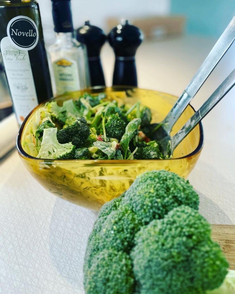 SkĂ€r broccolin i mindre bitar – anvĂ€nd Ă€ven stammen. SkĂ€r Ă€pplet i smĂ„ tĂ€rningar. LĂ€gg dessa i en skĂ„l tillsammans med spenaten. LĂ€gg i olja, vinĂ€ger, majonnĂ€s och kryddor och rör ihop. Rosta solrosfrön i en torr stekpanna tills de fĂ„tt lite fĂ€rg och strö pĂ„ dom.
