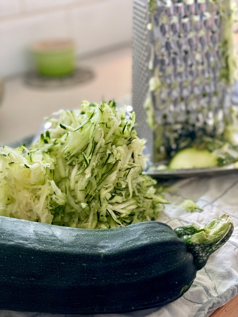 Riv zucchinin och dra ur all vätska du kan. Dela i två och lägg i en kökshandduk och kläm ur all vätska. Blanda i övriga ingredienser. Värm upp smör och lägg i smeten formad ungefär som fingrar. Stek tills de är jämnbruna runt om. Servera med såsen ovan eller någon annan sås du gillar.