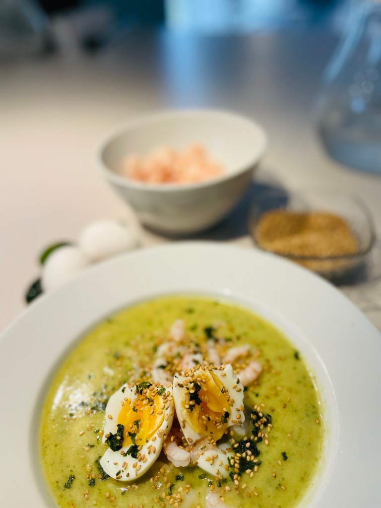 Koka under tiden äggen, skala och dela i halvor. Mixa soppan slät med stavmixer.